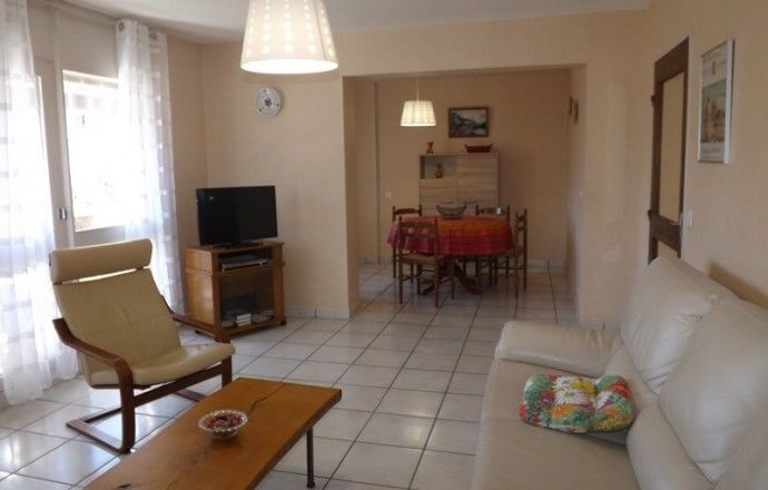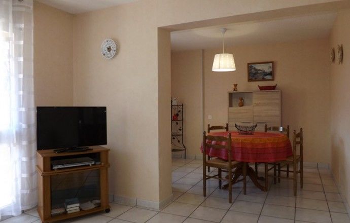 Salle à manger et séjour lumineux avec TV écran plat, cuisine fermée entièrement rénovée.