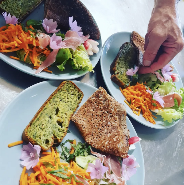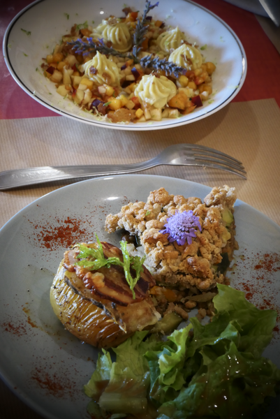 Quelques plats : Crumble de sarrasin aux lentilles de St-Flour et légumes confis, Blanquette de veau Ferrandais bio aux légumes de saison, Chou farci, Truffade, Bourriols maison sauce au bleu, Curry de volailles du Pays à l’indienne, côte échine confite au serpolet du jardin.