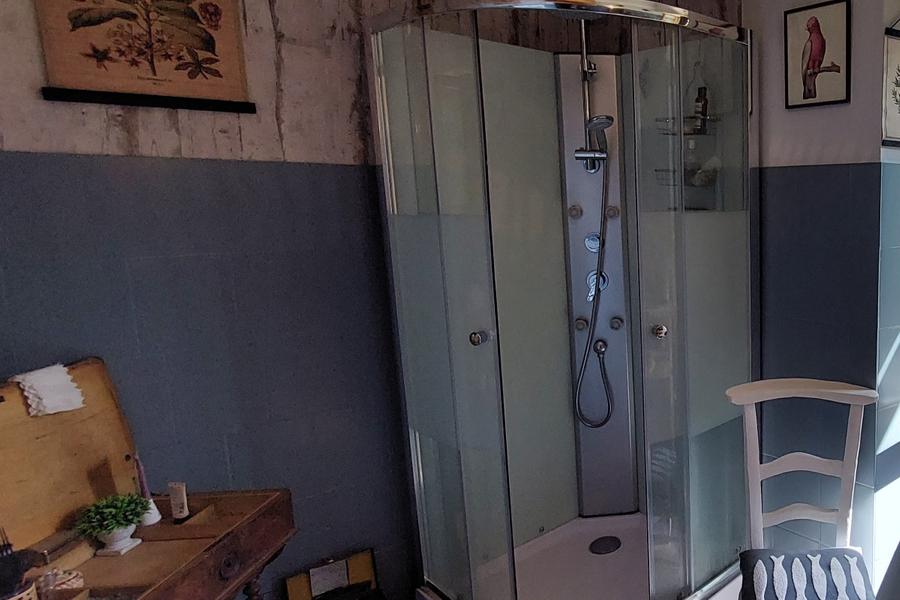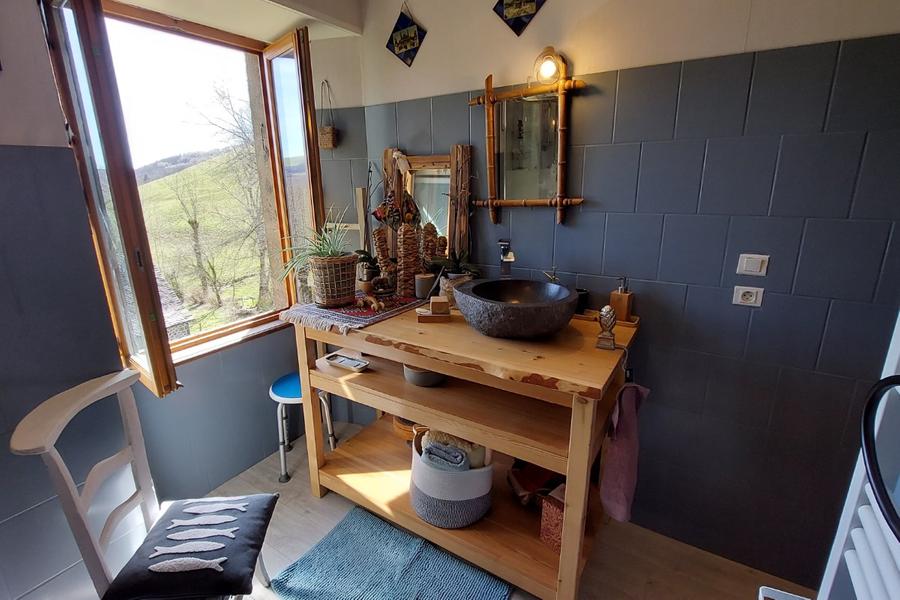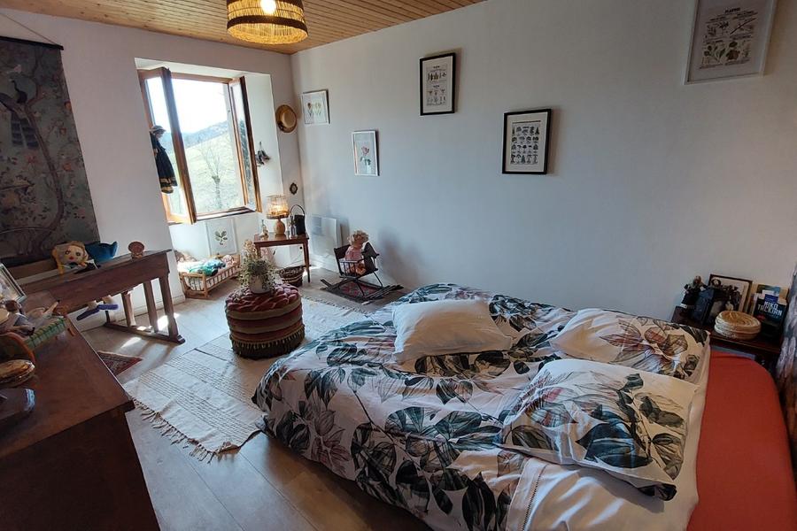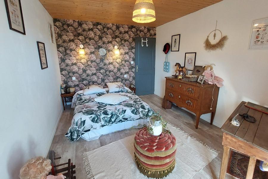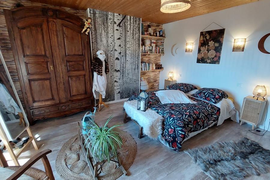 Un escalier en bois distribue de 2 belles chambres spacieuses et lumineuses de 13m² et 16m² et une salle d'eau avec jets hydro massants. Objets chinés, tapis tressés, papiers colorés, la décoration des chambres est poétique et vivante et surtout le confort est au rendez-vous. Depuis les chambres la splendide vue vue sur la campagne invite à la contemplation.
