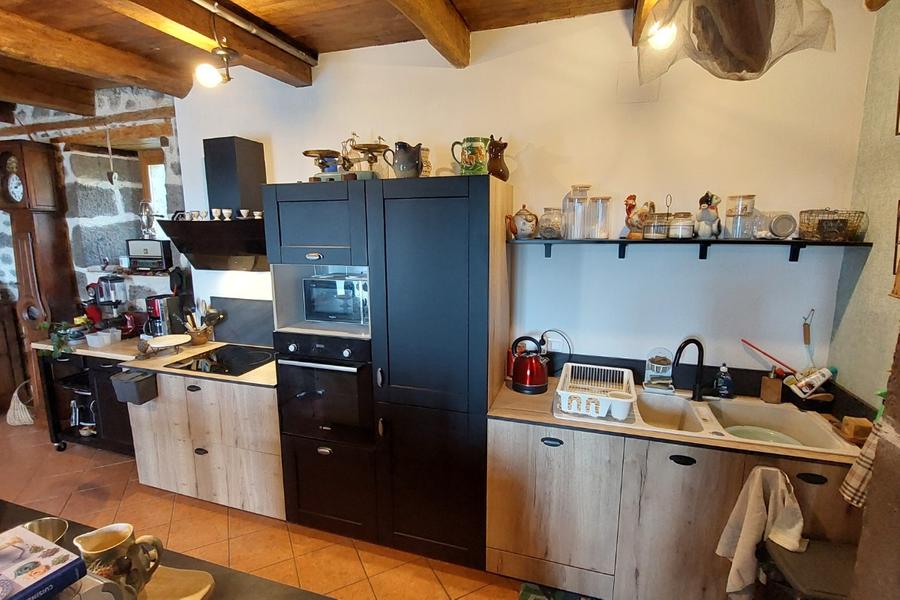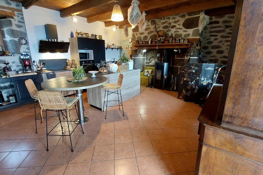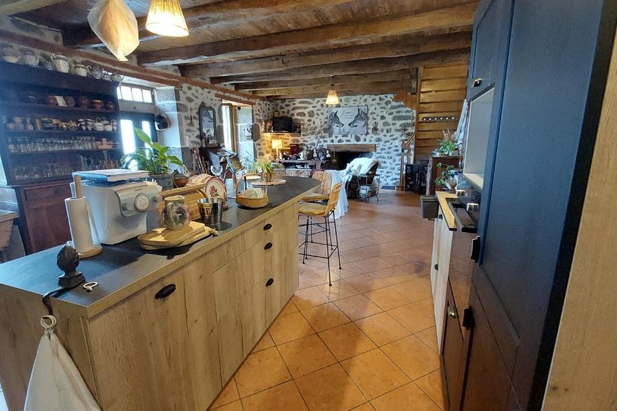 Au rez-de-chaussée, différents espaces s'organisent au sein d'une grande pièce de vie de 45m² . La cuisine ouverte aménagée autour d'un îlot central, est fonctionnelle et bien équipée. Elle dispose de tous les équipements nécessaires ( plaques de cuisson, four, lave vaisselle…). Le cantou, grande cheminée traditionnelle a été conservé et accueille un poêle à granulés.