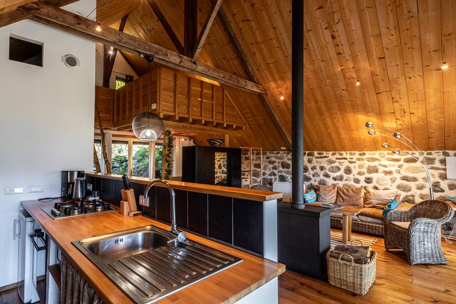 C'est un espace ouvert comportant : une chambre spacieuse avec un lit 160, 1 salle d'eau, une mezzanine avec 2 lits 90, un coin cuisine (tout équipé), un coin salle à manger/salon avec son poêle à bois.