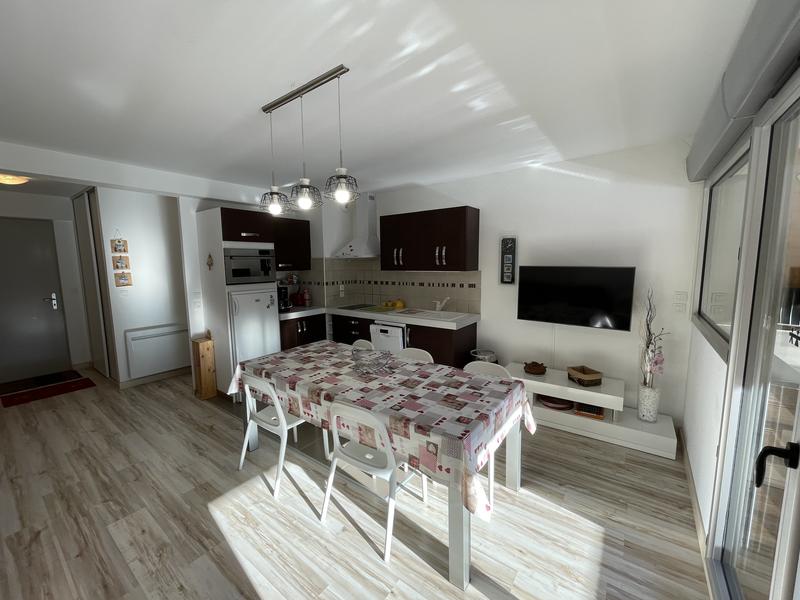 Exposition sud avec un grand balcon, salon, séjour avec cuisine équipée.