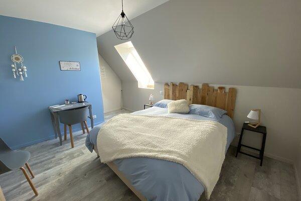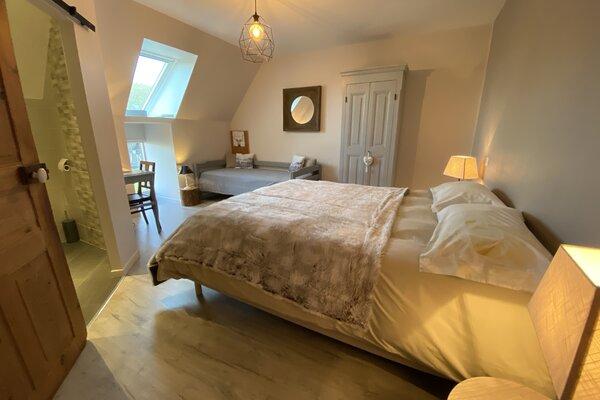 Nos trois chambres doubles, chacune équipée de sa salle d'eau et de wc privatifs, vous offrent un espace intime et confortable où vous ressourcer après vos escapades.