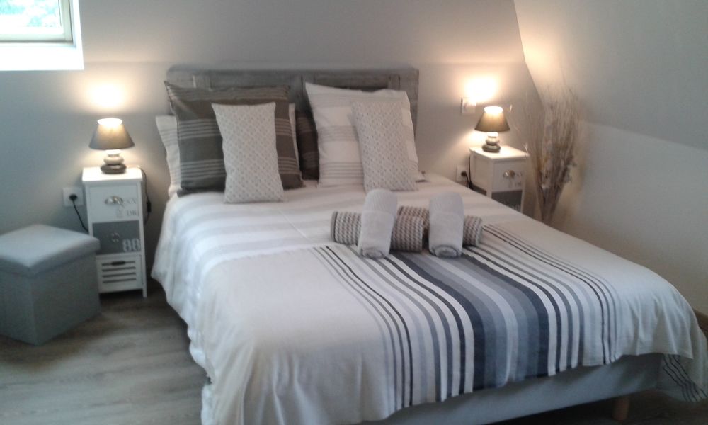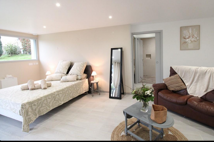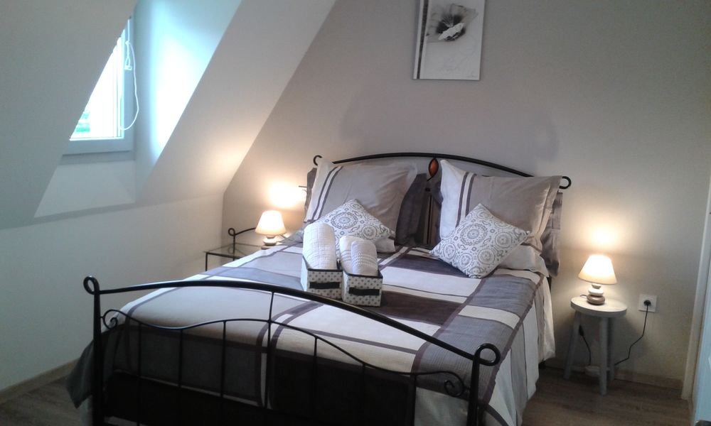 Dans une annexe située au fond de l'enclos, chambre familiale composée d'une chambre avec coin-détente, 1 lit 160X200, d'une chambre avec 1 lit 90X190 et 1 lit 115X190 et d'une salle d'eau spacieuse avec wc. Chambre de plain-pied accessible aux personnes à mobilité réduite et équipée d'une connexion internet wifi, TV écran plat et d'une climatisation réversible. Terrasse privative avec salon de jardin et vélo elliptique à disposition.