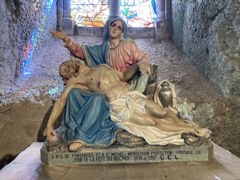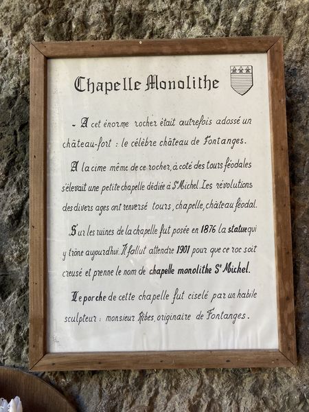 La chapelle monolithe Saint-Michel. En 1876, une statue de la Vierge est érigée sur le rocher où sera creusée la chapelle, inaugurée le 29 septembre 1901. En forme de croix, d'une superficie de 130 m² sur 7 à 8 mètres de haut, elle comprend une archivolte romane ornée du blason de Fontanges, un autel de pierre, un vitrail et une grille en fer forgé.