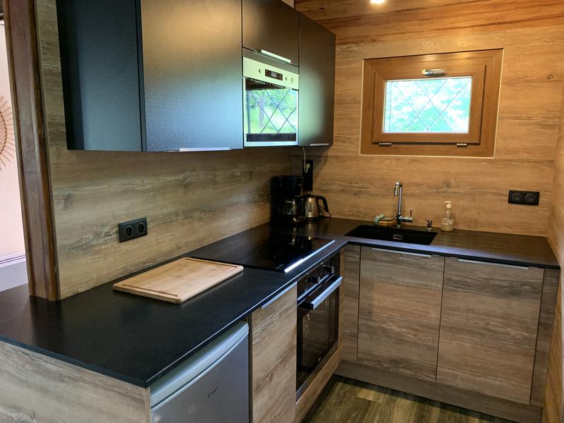 – Une vaste pièce composée d'un salon avec canapé convertible, d'une salle à manger disposant d'une très grande table en bois massif , d’une cheminée (en hiver, bois fournis pour une première flambée) et d'une cuisine équipée :