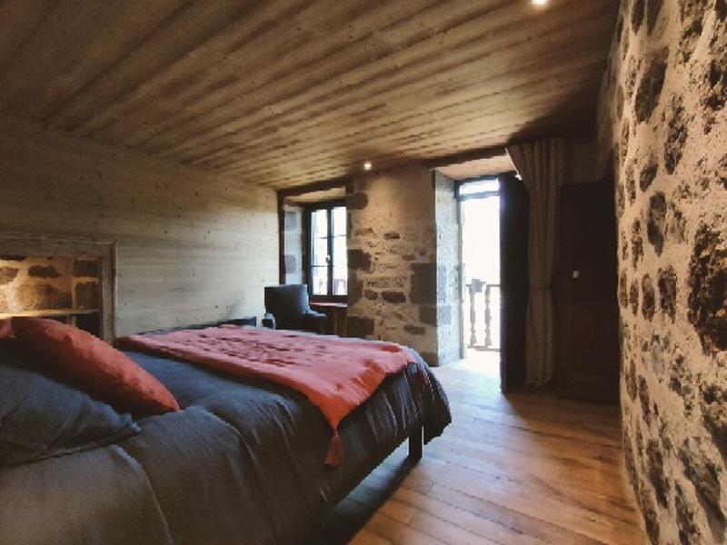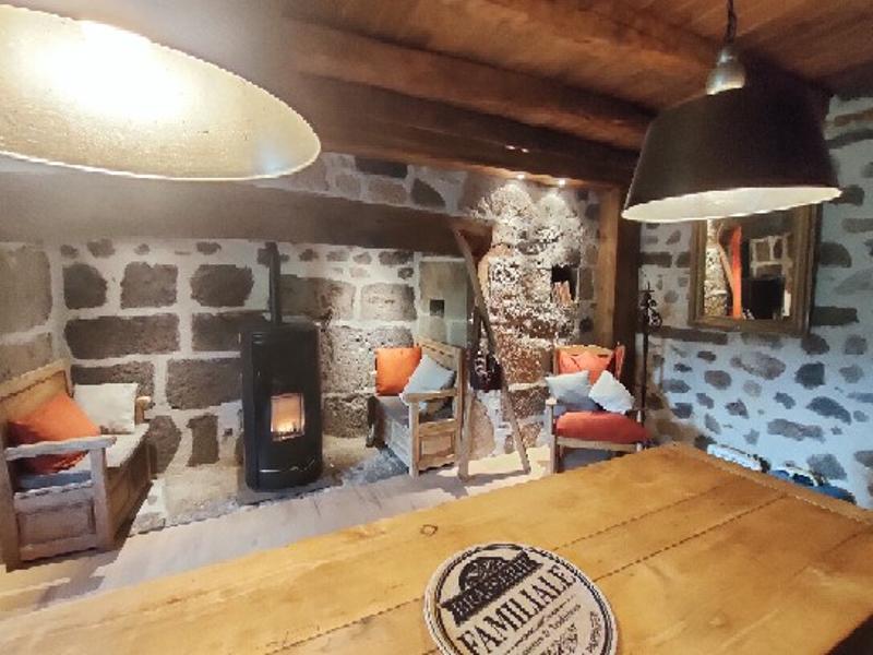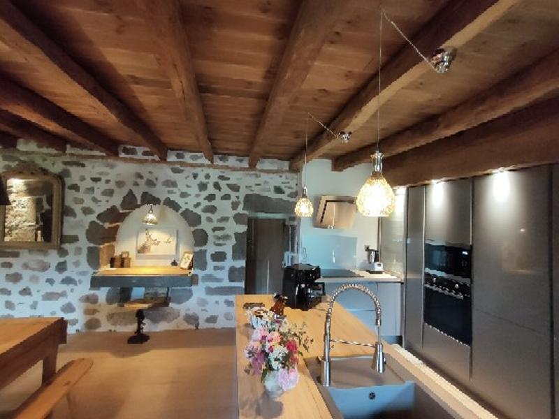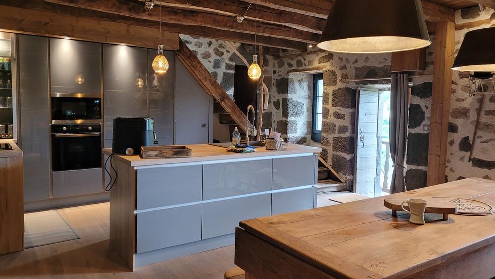 – au rez-de-chaussée : 1 suite privative avec lit 160 et salle de bain semi-ouverte, wc, coin bureau (point éthernet, wifi, coin lecture) avec vue sur la vallée ; une grande pièce à vivre avec cuisine ultra moderne toute équipée (les + : machine duo expresso, robot connecté..), . coin lecture près du poêle à granulés. Accès à l'arrière de la maison sur jardin de 40m² avec salon de jardin et coin repas.