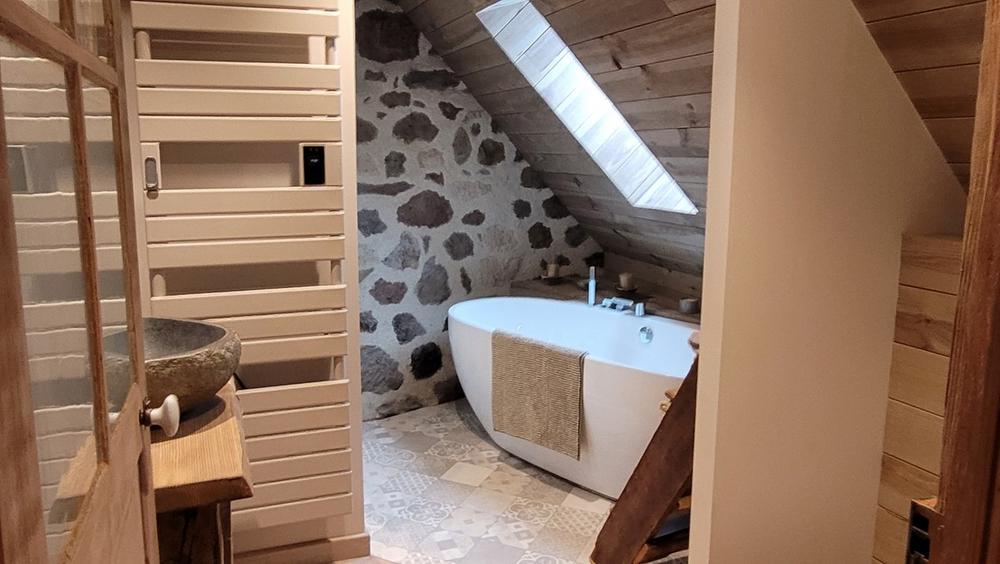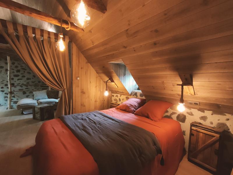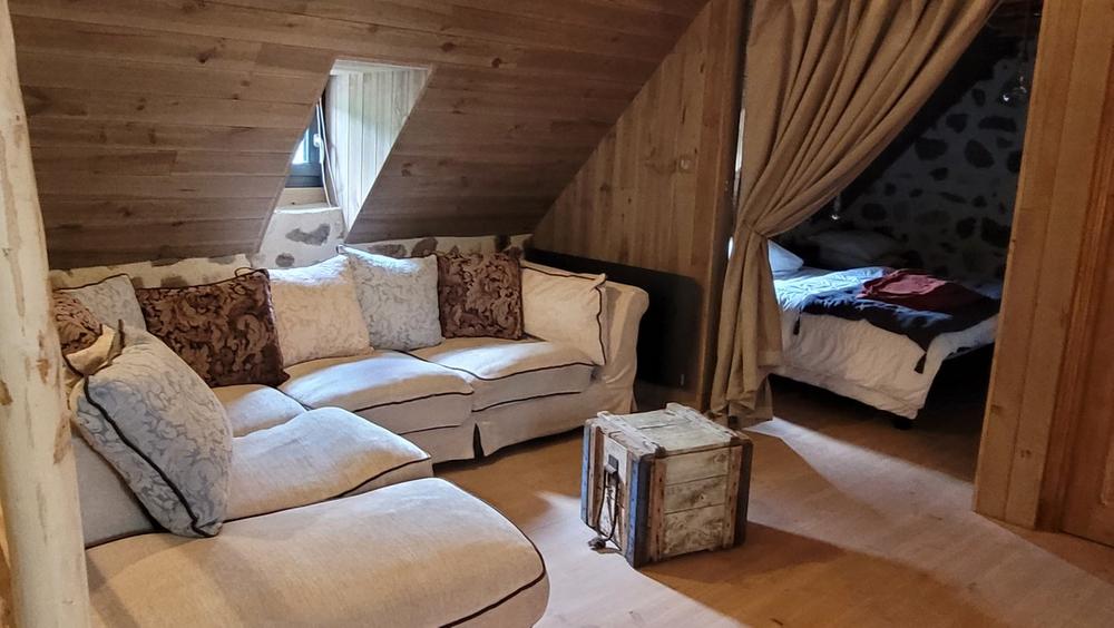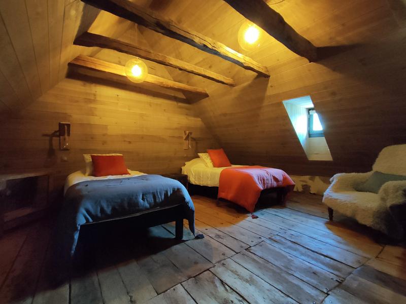– A l'étage : une grande chambre avec 2 lits séparés, un grand salon avec tv connectée, une salle de bain avec douche et baignoire îlot, wc, une petite chambre très cocooning semi-ouverte avec lit 140.