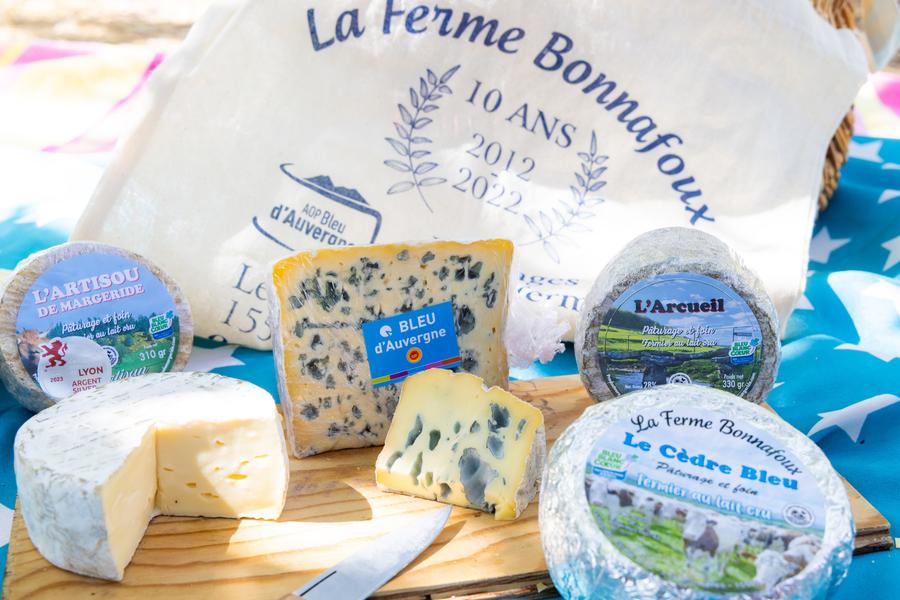 Visite de la ferme Bonnafoux, une exploitation familiale située en Margeride à plus de 1000 m d'altitude. Fabrication de fromages A.O.P : et de yaourts "maison" appellation Bleu Blanc Coeur.