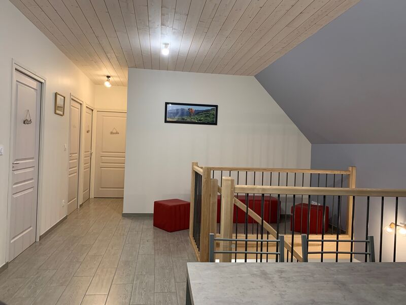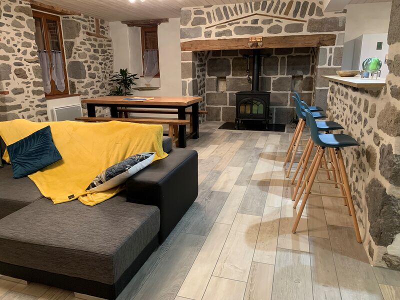 Nous avons décidé d'allier l'ancien au moderne. Grand espace de vie avec cantou auvergnat pour passer des moments chaleureux au coin du feu. 4 CH : 1 CH "Rose" avec WC et SDB – 1 CH "Verte" avec WC et SDB – 1 CH "Bleue" partageant SDB et WC avec 1 CH "Grise". Aire de jeux – Terrain clos – Jardin – Parking – Matériel bébé – micro ondes – réfrigérateur – LL – LV – TV.