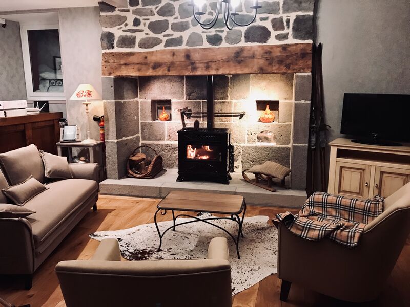 Petit salon commun avec poêle à bois TV (pas de TV dans les chambres).