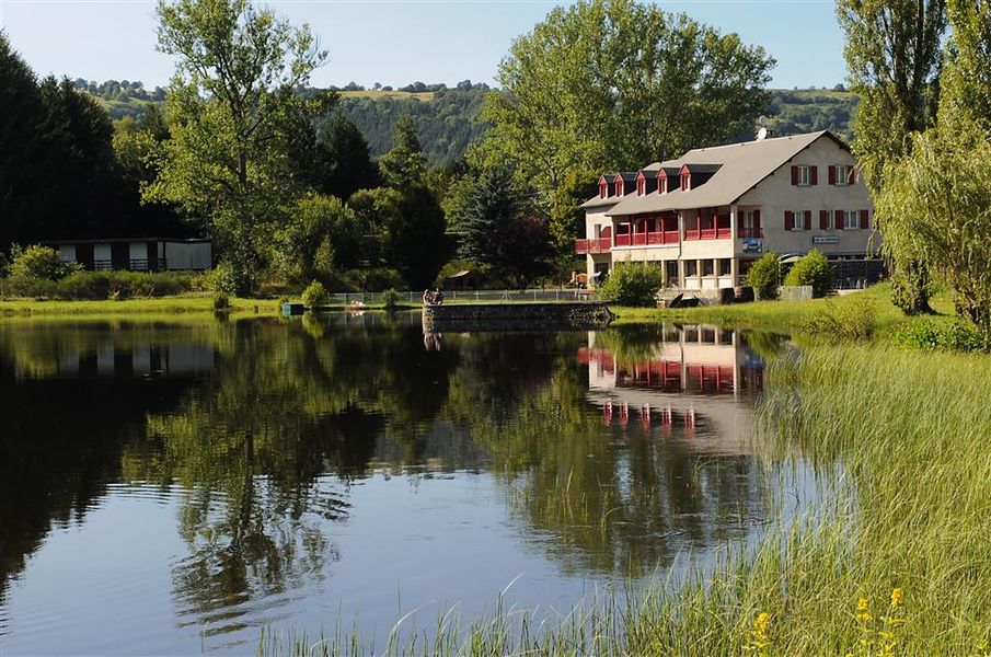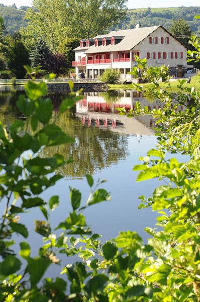 Hôtel-restaurant au bord d'un lac de 10 ha en l'entrée du bourg de Condat, entouré de forêts et verdure.