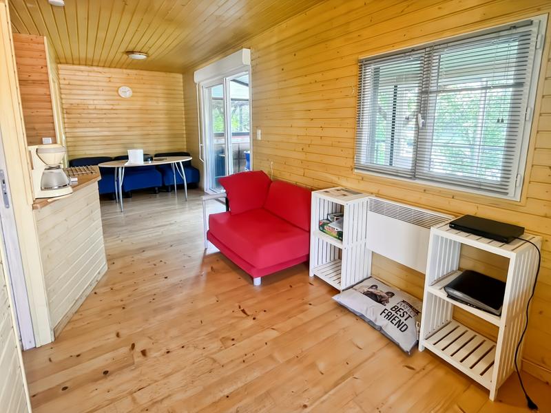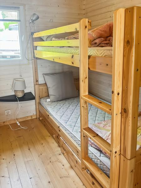 Le chalet est mitoyen avec le bas, mais vous bénéficiez d’un plein pied. Vous avez une terrasse et un accès direct au lac. Dès votre arrivée, vous pouvez vous garer dans la cour. Le logement se comporte d’une terrasse couverte, d’une cuisine, salle à manger et salon, de 2 chambres (une avec un lit double, une avec 2 lits simple superposés), une salle de bain avec toilette et machine à laver. Le logement est atypique, et vous fera vivre des vacances agréable au bord de l’eau. Vous avez un accès au lac directement du logement. Vous avez à disposition un canoë 2 personnes. Un ponton privé pour le logement du haut et du bas à votre disposition. Les draps et serviettes ne sont pas compris dans la prestation.