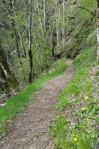 Au bout de cette ruelle, emprunter la petite passerelle pour traverser le ruisseau "L'Iraliot" ; le chemin s'élève rapidement pour passer près du château d'eau. Au croisement, continuez sur votre gauche pour un aller/retour jusqu'à la cascade de la Conche. De retour au croisement, monter en direction du Castel (pause panoramique) puis redescendez en prenant à droite le sentier qui vous ramènera à proximité de la chapelle du Calvaire;