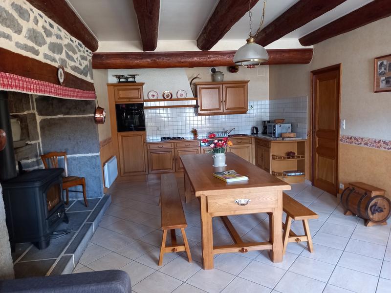 Coin cuisine aménagé, séjour avec cheminée type cantou avec poêle Godin bois gratuit, télévision écran plat, une chambre avec lit 140, salle d'eau et WC indépendant; Coin buanderie avec local de rangement à disposition, chauffage électrique selon consommation, terrain clos avec vue sur montagne et forêt.
