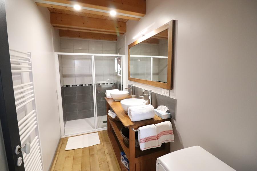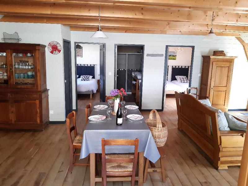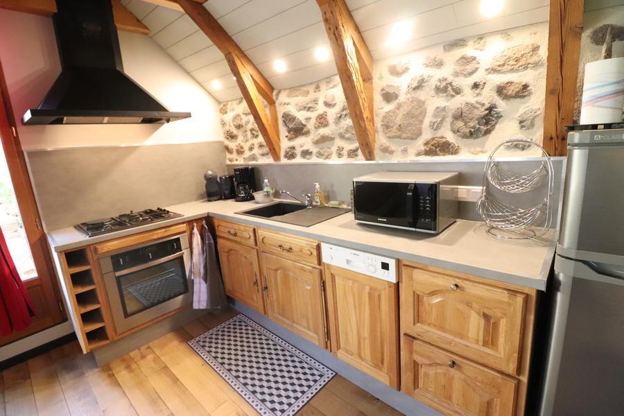 2 chambres (1 lit de 160 et 2 lits de 90) avec vue sur les bois et la rivière ou sur le jardin familial. Une salle d'eau avec douche, deux vasques, un lave linge, un WC indépendant, un salon avec coin TV/DVD. Canapé, bibliothèque, poêle à bois, un espace repas, une cuisine toute équipée (lave-vaisselle, micro-ondes, compartiment congélateur, cafetière traditionnelle et SENSEO…).