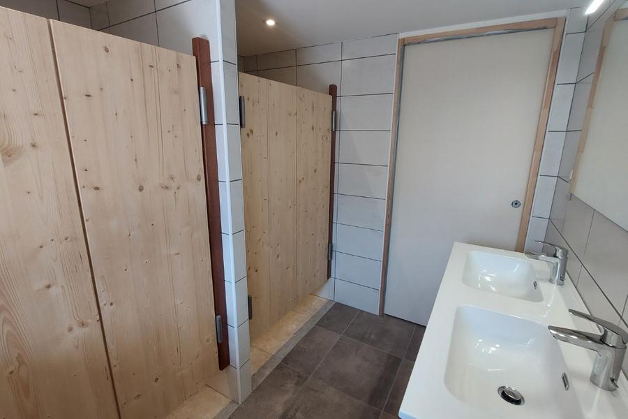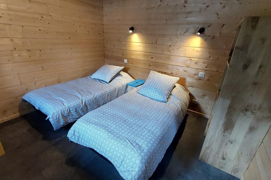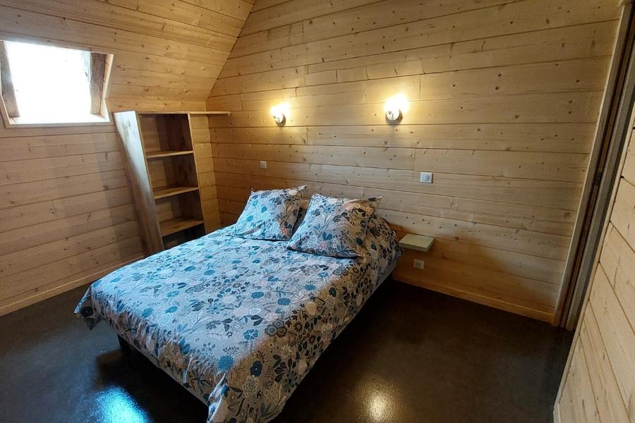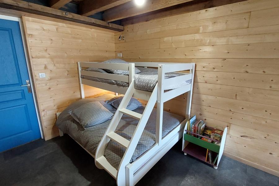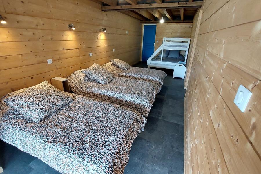La chambre dortoir dispose d'une capacité de 6 couchages et possède également un accès sur l'extérieur. Elle se compose de 3 lits simples alignés et d'un lit superposé pour 3 personnes. Le lit du haut (90x190cm) peut accueillir une personne tandis que 2 personnes peuvent dormir dans le lit du bas (140x190cm).