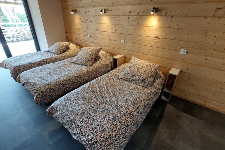 Bois clair aux murs et sobriété de la décoration sont de mise dans les 3 chambres du rez-de-chaussée. Une première chambre est pourvue de 2 lits simples (90x190cm). Une deuxième chambre, qui communique avec la chambre dortoir, est dotée d'un lit double (140x190cm). Une porte-fenêtre donne accès à une terrasse couverte.