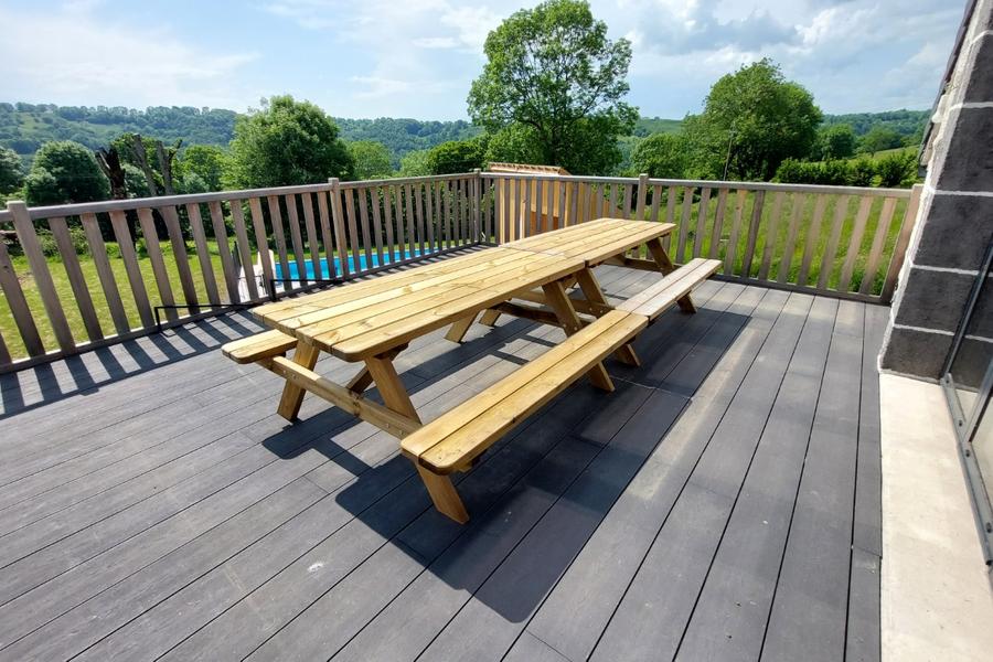 Dans cette location de vacances de 180m² les pièces de vie se situent à l'étage et la majorité des pièces de nuit sont au rez-de-chaussée. On pénètre dans le gîte, soit par la porte d'entrée du rez-de-chaussée, soit par l'escalier qui mène à la terrasse suspendue.