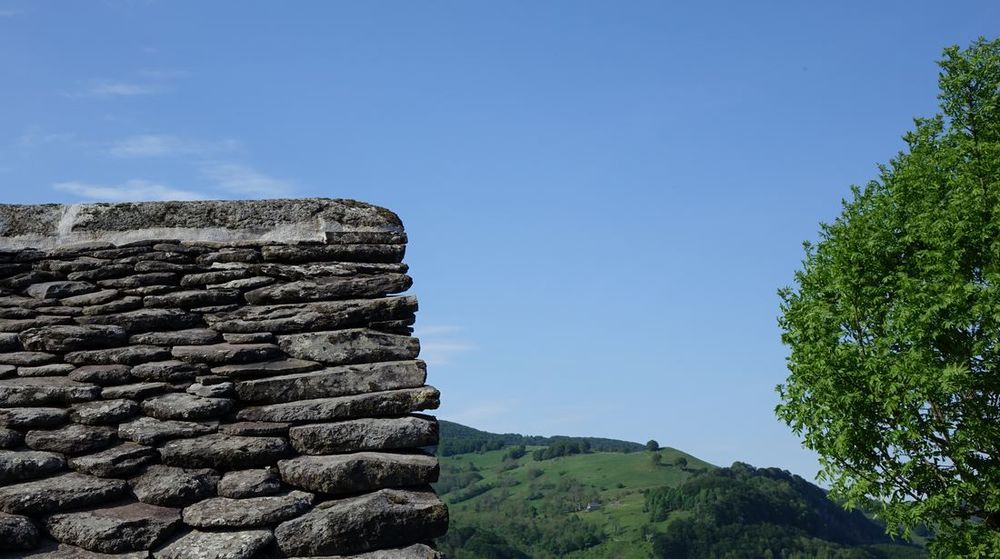 Passez sous cet arche de pierre, puis suivez le chemin qui redescend jusqu'à la route, que vous suivrez pour rejoindre le point de départ.