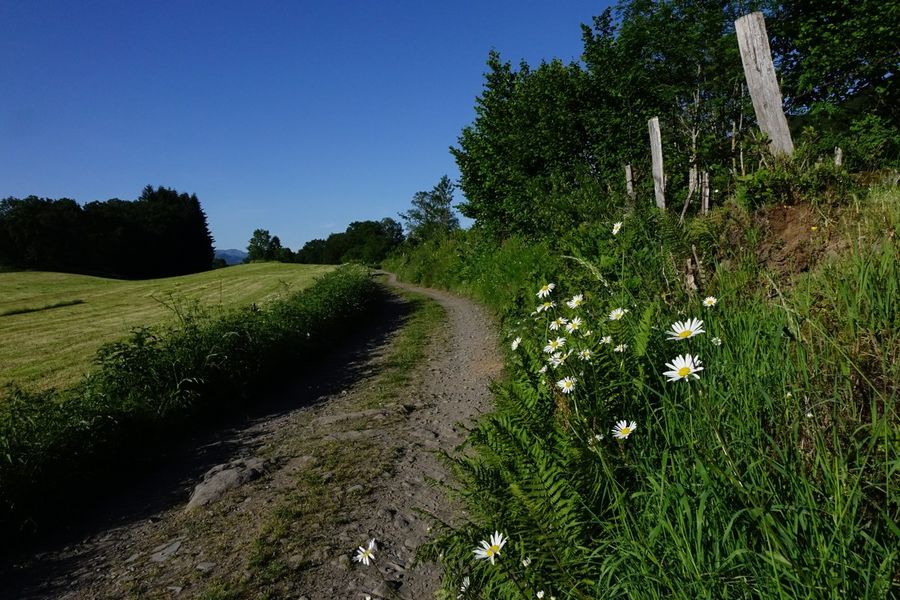 Une fois la chicane passée, le sentier passe entre prairie puis le long d'une partie boisée pour rejoindre le hameau de Vixouze.