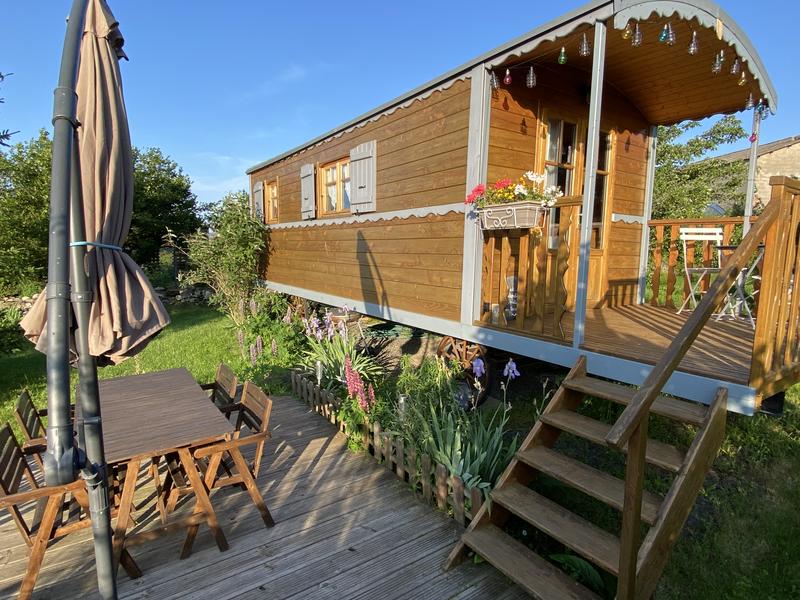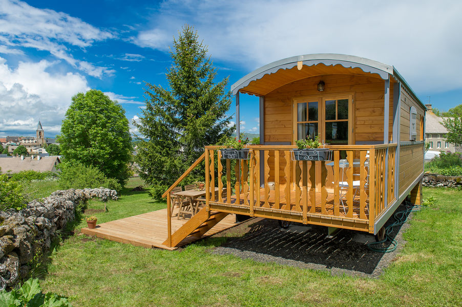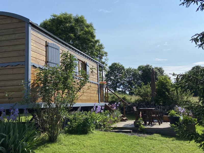 A Coltines, petit village sur la Planèze de St-Flour, plateau volcanique à 950 m d’alt, entre les Monts du Cantal et les Gorges de la Truyère, la roulotte au fond du pré, hébergement insolite, vous offre calme, sérénité et charme.