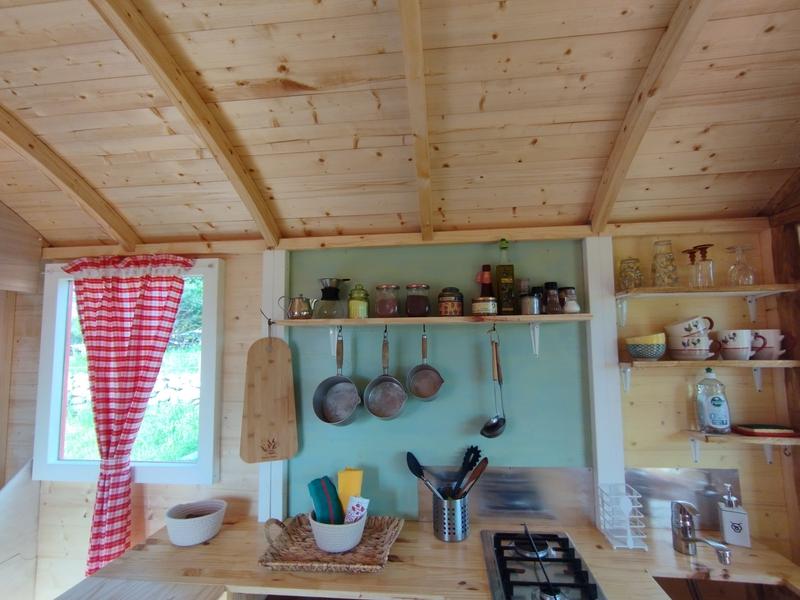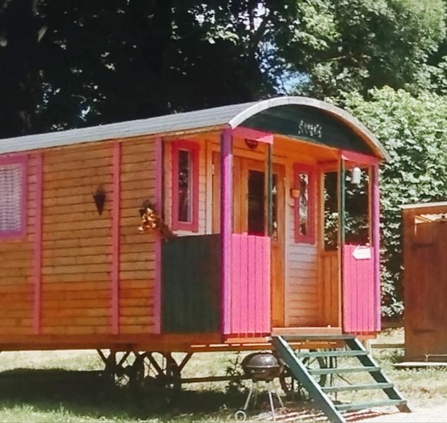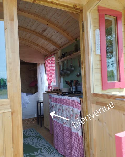 Cette roulotte toute en bois, dispose d' une kitchenette équipée, un lit double en alcôve, fauteuils, de belles ouvertures pour admirer la nature, entendre le chants des oiseaux. Une table coulissante, meubles en pin, table de cuisson au gaz et ustensiles de cuisine pour concocter des petits plats. Les lampes sont rechargeables (batterie fournie). Une vraie glacière avec blocs réfrigérants renouvelés tous les jours. Une terrasse couverte et une belle terrasse sur jardin avec mobiliers, barbecue, et banquette en bois vous attendent. Vous trouverez en dépendance, en bois, une douche à eau chaude instantanée et des toilettes sèches privatifs.