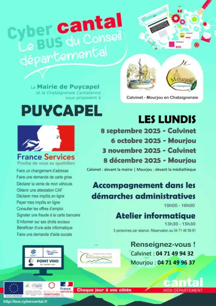 – Un accompagnement dans les démarches administratives de 10h à 16h : changement d'adresse, demande de carte grise, déclaration de la vente de votre véhicule, attestation CAF, déclaration des impôts en ligne, consultations des offres d'emplois, signalement d'une fraude à la carte bancaire, information sur vos droits sociaux, aide informatique, demande d'aide sociale.