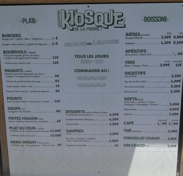 Le Kiosque, vous propose été et hiver une cuisine maison faite à partir de produits locaux. Au menu, des burgers, des bourriols (crêpes auvergnates) des pagnats (panini au pain de campagne), des spécialités régionales, des soupes (l'hiver), des desserts.