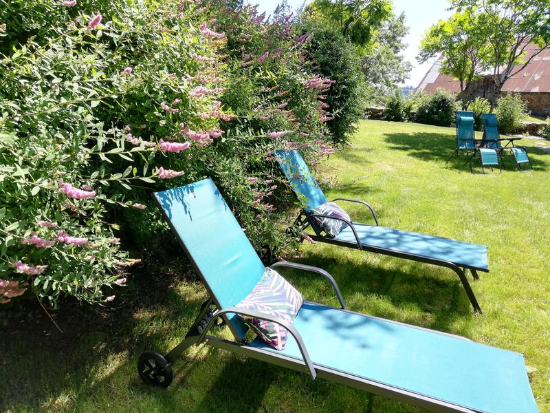 Ce gîte dispose d'un terrain de 800m² avec piscine, salon de jardin, chaises longues, parking privatif et abri couvert non clos pour motos et vélos.