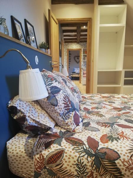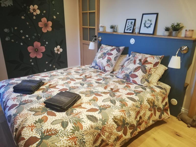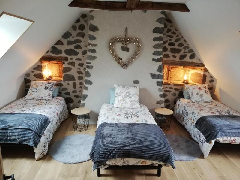 A l'étage : coin détente équipe d'une banquette, d'une TV et d'une bibliothèque. 1 chambre avec 1 lit 160×200 avec salle de bain privative. 1 chambre avec 3 lits 90×200 (modulables en 1 lit 180×200), une salle d'eau et un WC indépendant. Lits faits à l'arrivée et linge de toilette fourni. Chauffage électrique inclus. tarifs toutes charges comprises hors ménage. Gîte non fumeur. Prise renforcée pour recharge voitures électriques à disposition (30€/semaine).