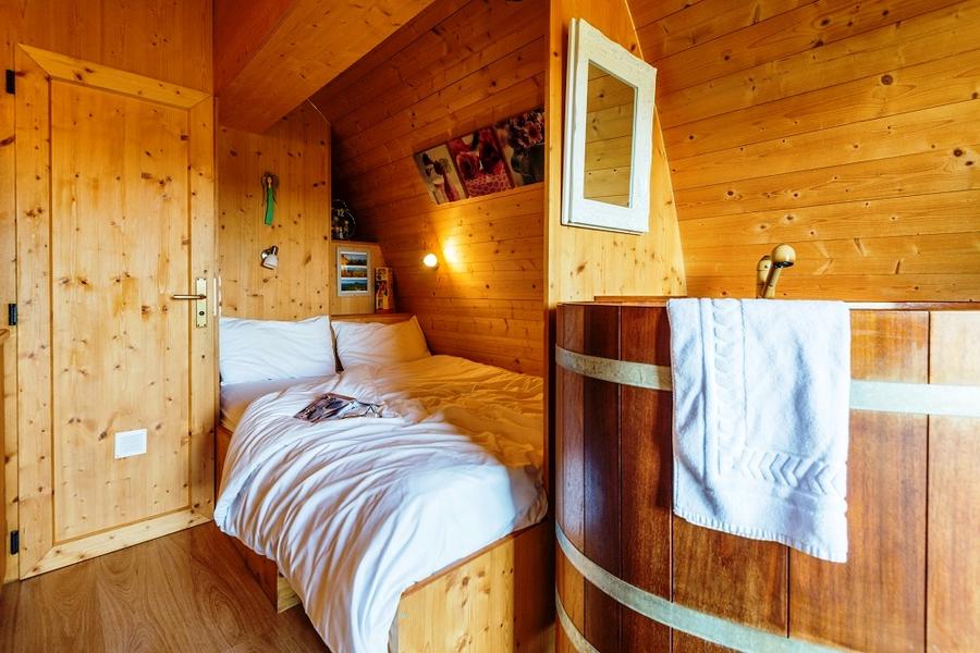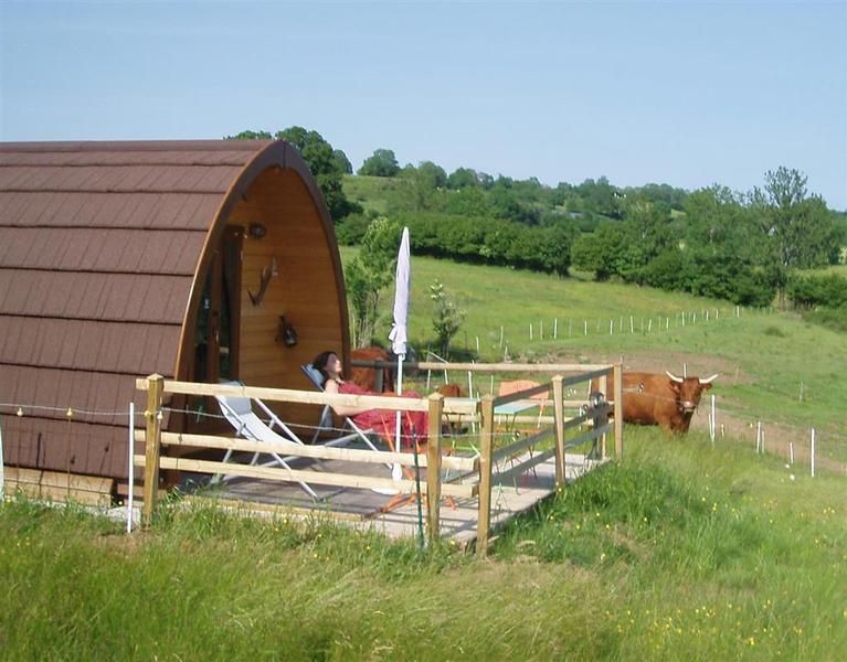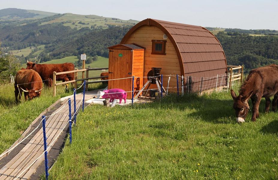 Aménagé pour un couple, en éco construction bois, basé sur le thème des estives et de la vache salers, équipé d'une baignoire en bois 2 places pour un bain relaxant à base de lait parfumé à la rose et aux coquelicots. Frigo mini bar, cafetière, lit (couette), SDB Douche-WC, radiateur électrique, climatisation en option – vue panoramique – un ouvrage sur le Cantal.
