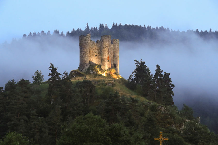 Bâti sur un piton dont le barrage de Grandval a fait une presqu'île, le château d'Alleuze fut acquis par les évêques de Clermont à la fin du Xllle siècle. Ils souhaitaient en faire un grenier à dîmes et une prison pour leurs justices du Cantal. Cependant, après la création de l'évêché de Saint-Flour, les prélats de basse-Auvergne se désintéressèrent de la forteresse. Mal gardée, celle-ci devint un dangereux repaire de brigandage. En 1383, elle fut prise par une bande de routiers emmenée par Bernard de Garlan, bien- tôt surnommé le «Méchant Bossu d'Alleuze». Pendant près de dix ans, il allait terroriser la Planèze, avant de consentir à vider les lieux contre le paiement d'une forte indemnité. Les Sanflorains entreprirent alors de démolir le château. Condamnés par le parlement de Paris, ils durent le réédifier à leurs frais.