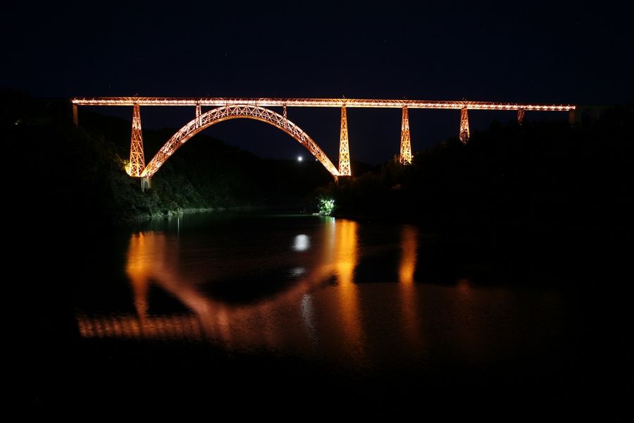 L’histoire du viaduc de Garabit (1880-1884) est celle d’une construction extraordinaire, impossible selon certains, qui a su surmonter les obstacles d’une nature accidentée en créant un chef d’œuvre à la valeur intemporelle. Sa silhouette aérienne et dentelée le hisse au rang d’œuvre d'art. Habillé de rouge, l'esthétisme et la finesse de construction se révèlent grâce à une superbe mise en lumière.