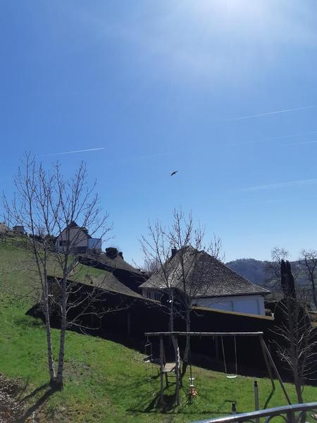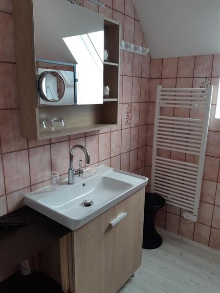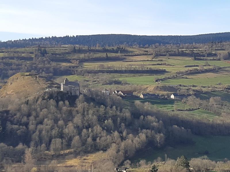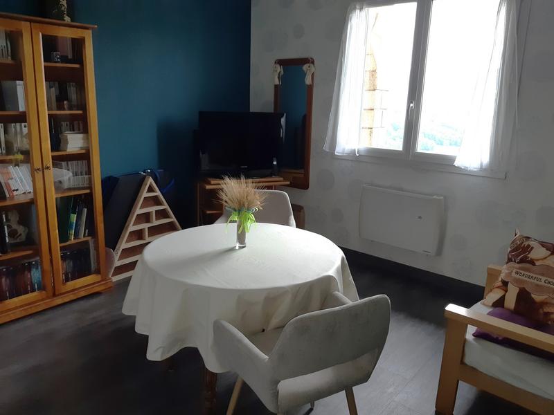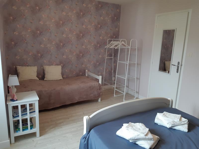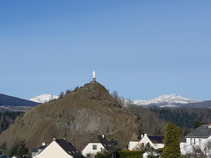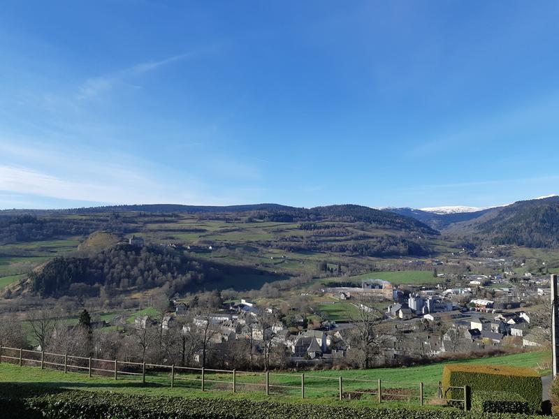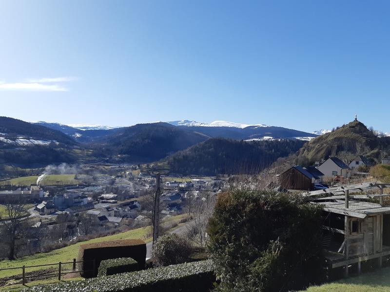 Chambre familiale avec salle de bain attenante dans notre maison avec une vue magnifique sur les monts du Cantal. Un salon avec des jeux vous est réservé ainsi que pour le petit déjeuner inclus. Cuisine à votre disposition si besoin.