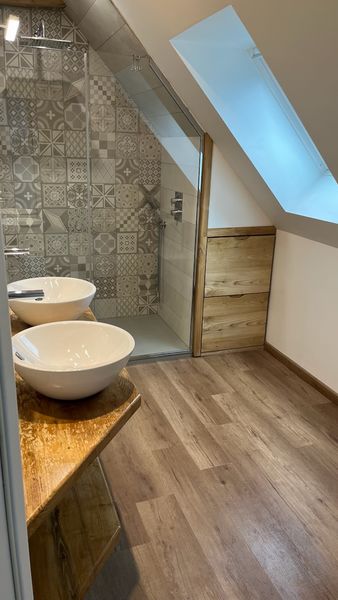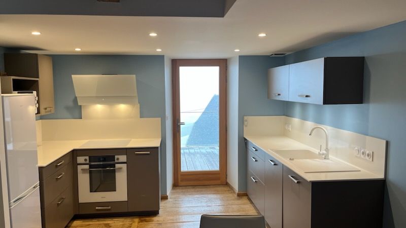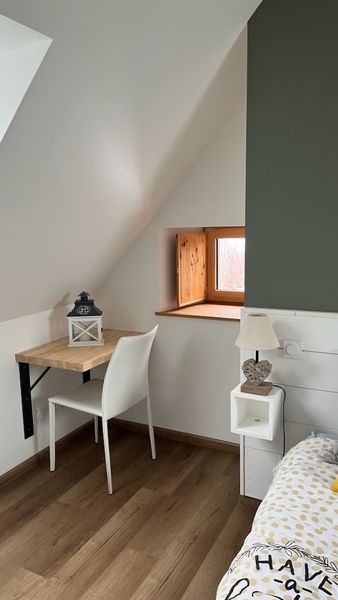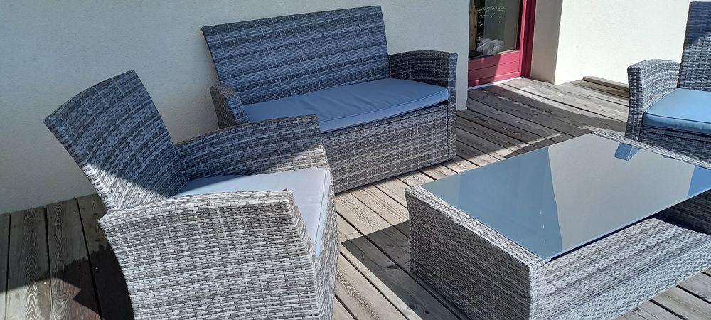 Une cuisine encastrée, salon, cheminée avec bois offert, buanderie, 2 WC séparés, une salle de bain avec douche. Un grand placard de rangement, 2 chambres. Terrasse couverte avec pergola bio-climatique. Salon de jardin, terrain clos de 200m². Parking – Prêt de matériel bébé.