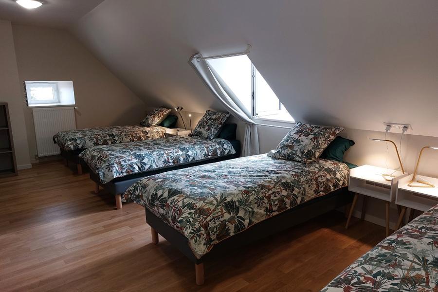 – au 2ème étage : une chambre dortoir avec 4 lits de 90*200 également jumelables, une salle de bain.