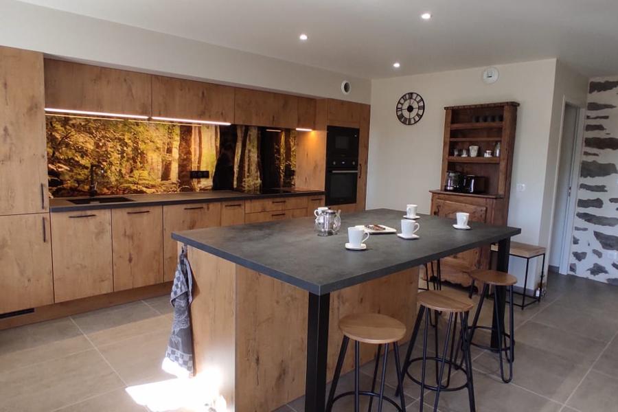 – au rez-de-chaussée, les pièces de vie : un salon de 40m² avec cheminée et poêle à bois, une grande cuisine moderne ouverte sur salle-à-manger avec cheminée et un coin "souillarde", un espace de détente avec table de ping-pong, une buanderie-chaufferie avec machine à laver et sèche linge.