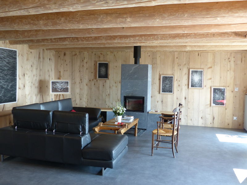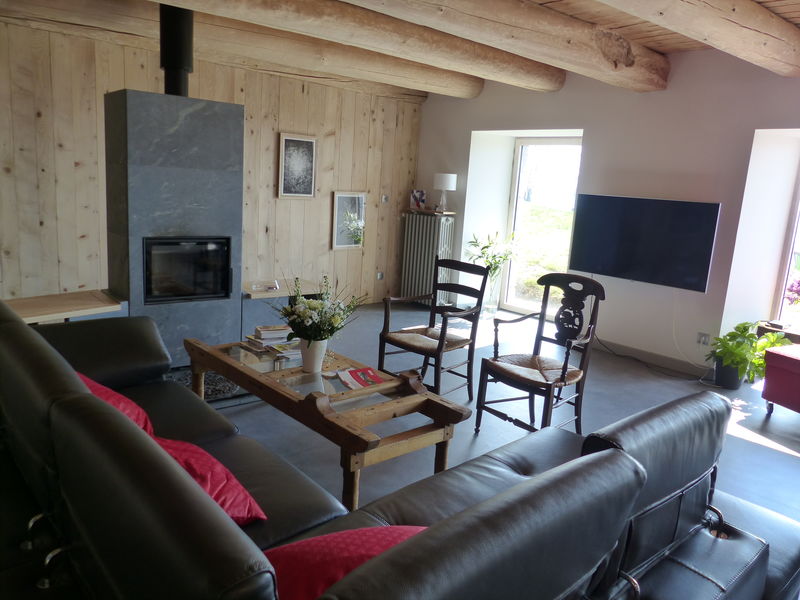 Au rez de chaussée, grand séjour 70 M2 avec poêle-cheminée, Cuisine aménagée ouverte sur le séjour, buanderie, WC (PMR).