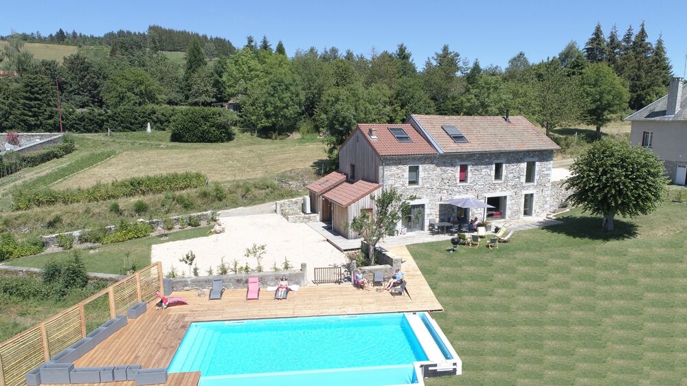 4 chambres, 4 salles d'eau, 4 couples + 2 enfants, piscine chauffée privative, située à 1050 m d’altitude, avec vue exceptionnelle sur le Plomb du Cantal, le viaduc de Garabit, la Margeride et l’Aubrac. Exposition Sud-Ouest.