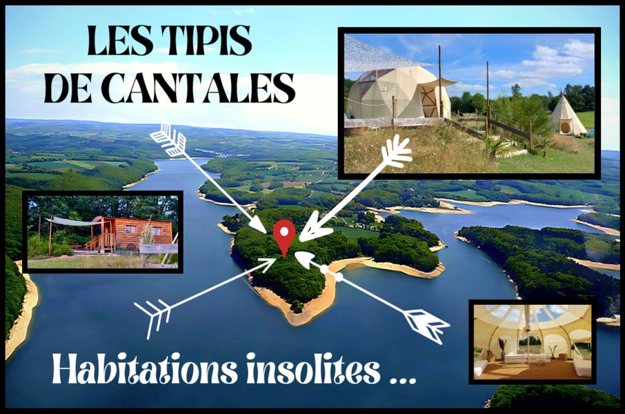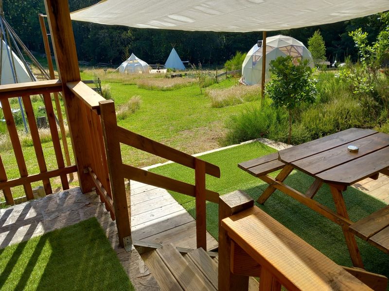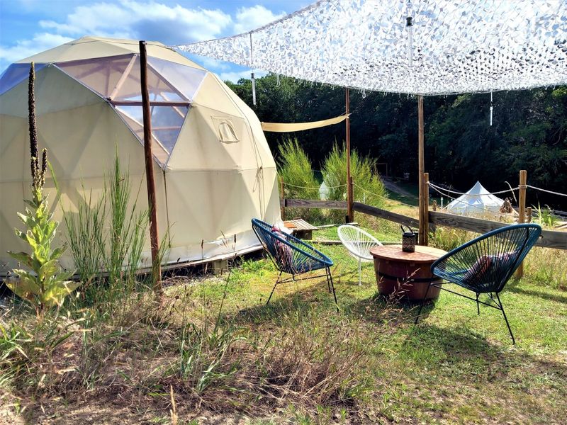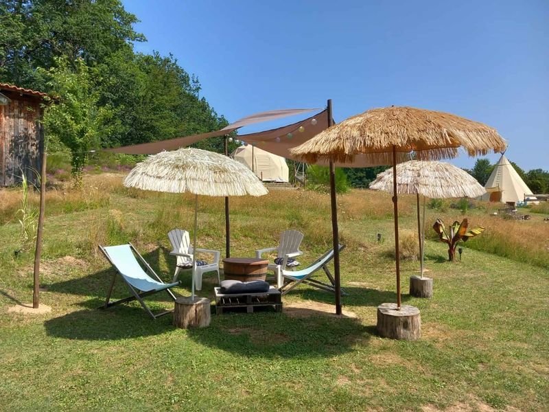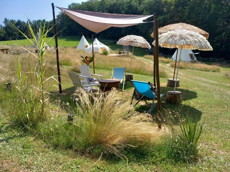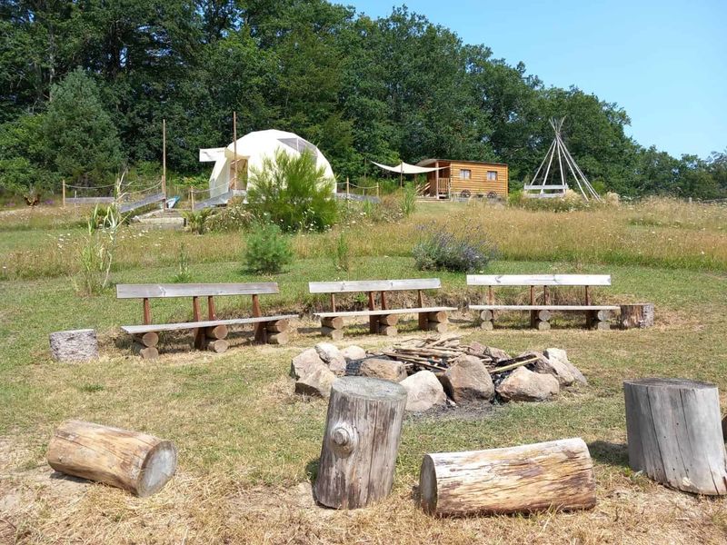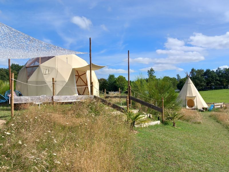 Ce camp insolite de trois tipis, un dôme géodésique, une roulotte et une tente lotus vous accueille d'avril à octobre, au bord du lac de Saint-Étienne-Cantalès.