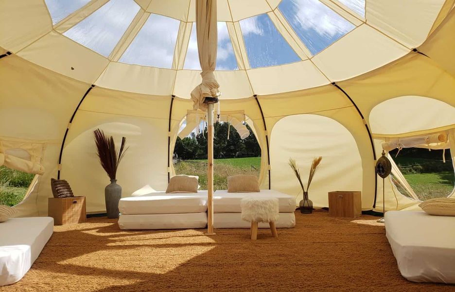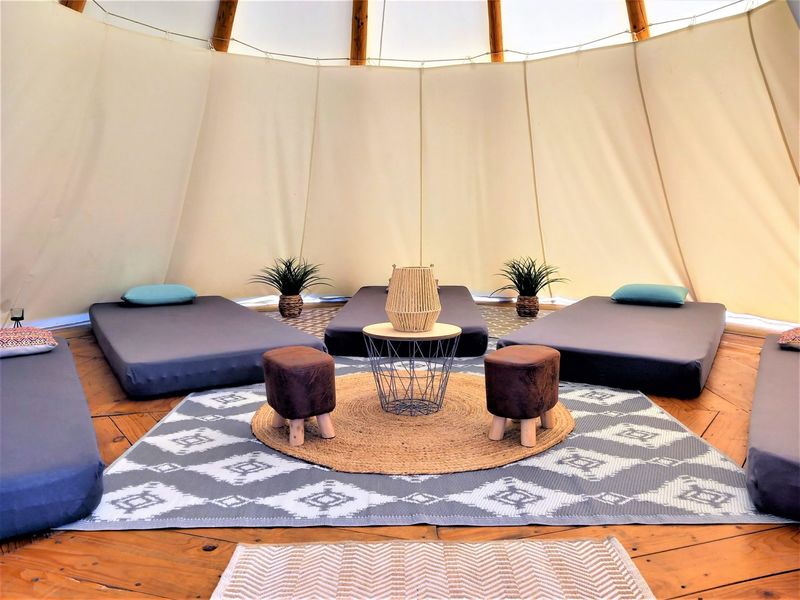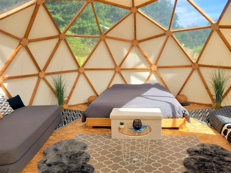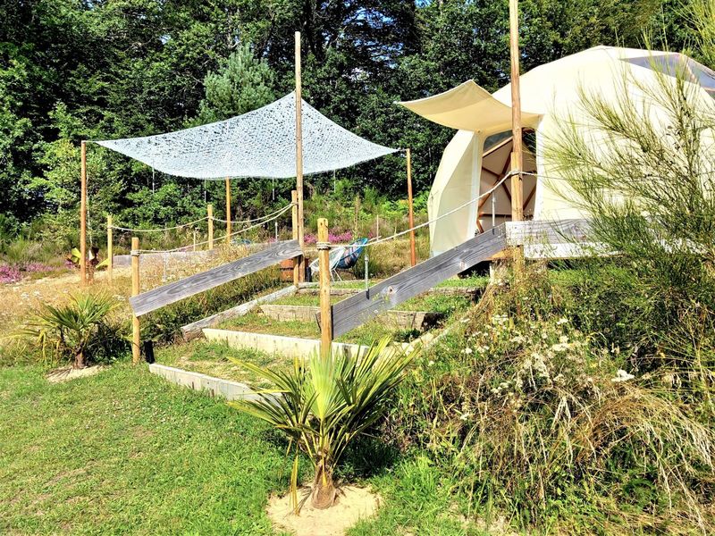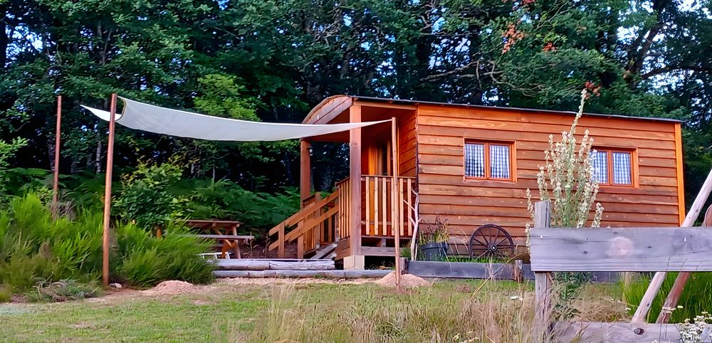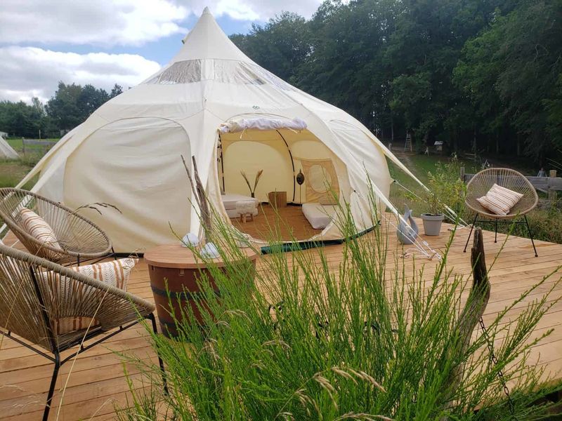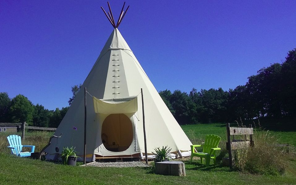 Ce camp insolite de trois tipis, un dôme géodésique, une roulotte et une tente lotus vous accueille d'avril à octobre, au bord du lac de Saint-Étienne-Cantalès.