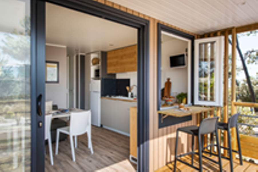 Chaque lodge est équipé d'une terrasse couverte avec transat et mange debout, un salon living, TV et une cuisine d'appoint avec réfrigérateur.