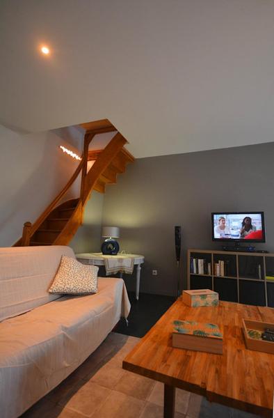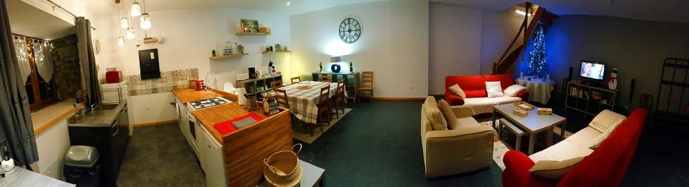 Grande pièce de vie au rez-de-chaussée (52 m²) avec cuisine ouverte (réfrigérateur-congélateur, cuisinière gaz, lave-vaisselle, lave-linge, micro-ondes) et salon (TV et radio numérique HD).