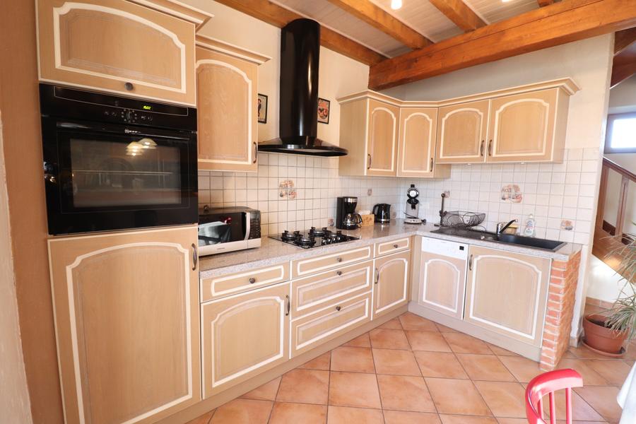 Au RDC, cuisine intégrée, séjour avec poêle à bois, TV, lecteur DVD, coin bibliothèque, WC indépendant.