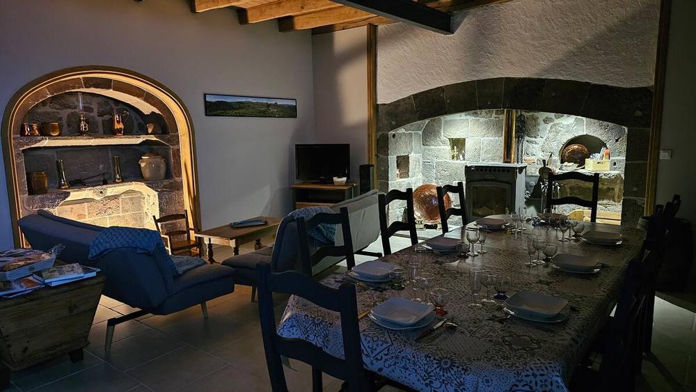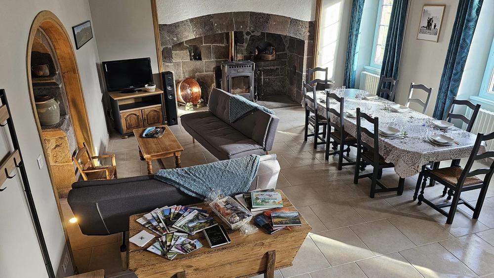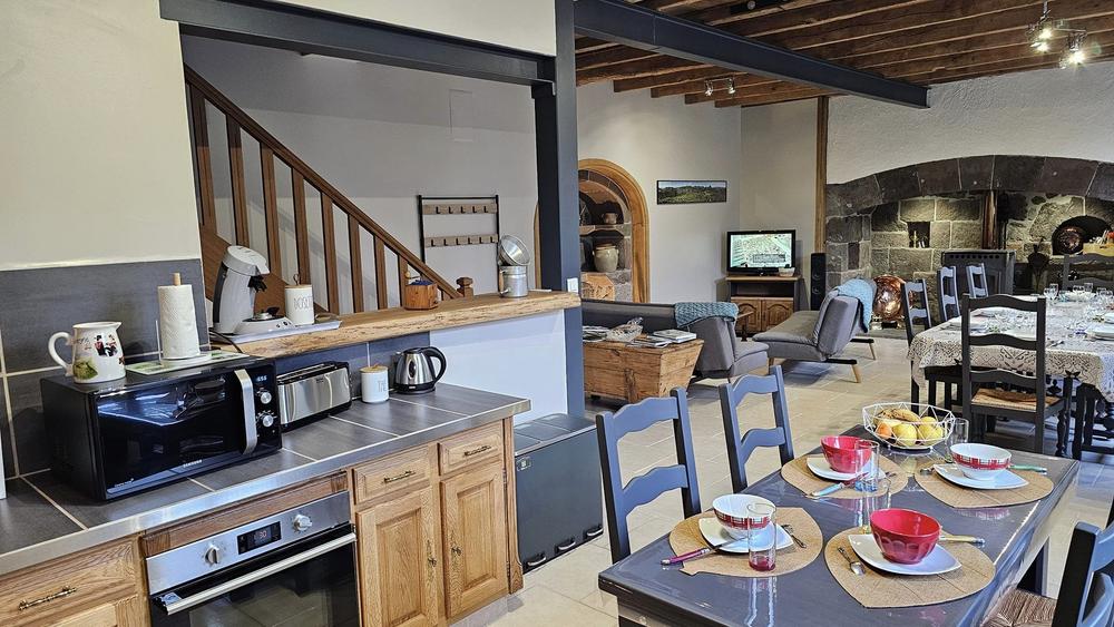 >grande pièce de vie de 45 m² son cantou Auvergnat, sa souillarde et sa cuisine ouverte.