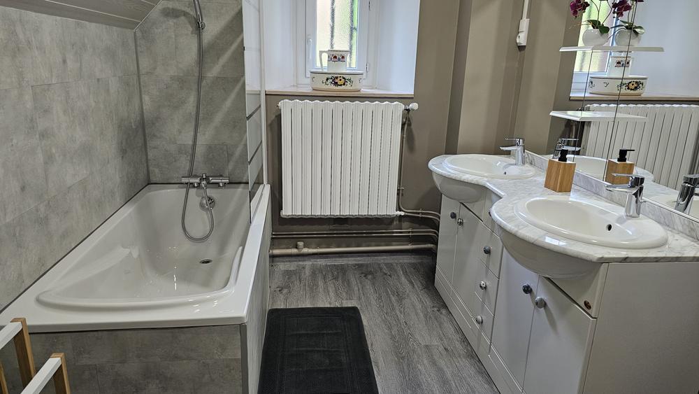 >salle de bain (douche, baignoire et meuble double vasque) de 10 m²