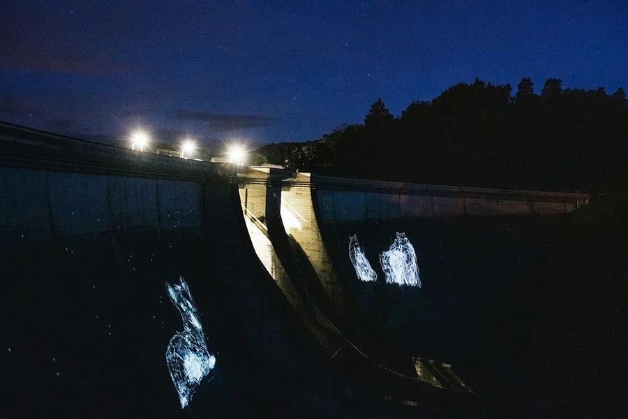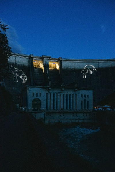 A ces constellations, se joignent des dessins animés projetés à même la paroi, déclenchés à la tombée de la nuit. Chaque jour de la semaine correspond à un cycle. Transformant le barrage en cinéma en plein air.
