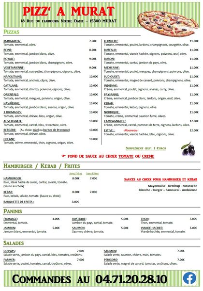 Pizzeria et snack à emporter. Commandes par téléphone. Pizzas, hamburgers, kebabs, paninis et salades.
