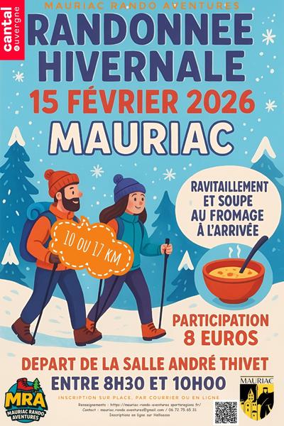 1ère rando hivernale organisée par Mauriac Rando Aventures, 2 parcours de 10 ou 17 km, ravitaillement et soupe au fromage à l'arrivée. Départ depuis la salle André Thivet de 8h30 à 10h.